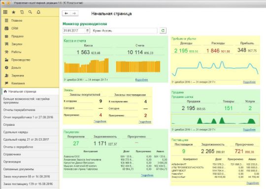 Торговля и склад, услуги и работы, закупки и резервы, банк и касса, кадры и расчет зарплаты, производство и сборочные операции, аналитические отчеты и CRM.